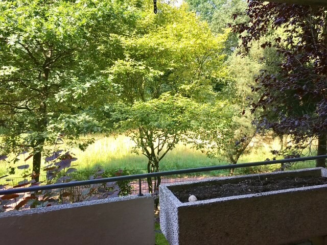 Jedes Fenster dieser Wohnung gewährt einen schönen Blick ins Grüne, was das Wohngefühl zusätzlich bereichert. Die Loggia misst 12 Quadratmeter, ist mit einem großen eingebauten Blumentrog ausgestattet und bietet durch ihre ruhige Lage eine ungestörte Rückzugsmöglichkeit.